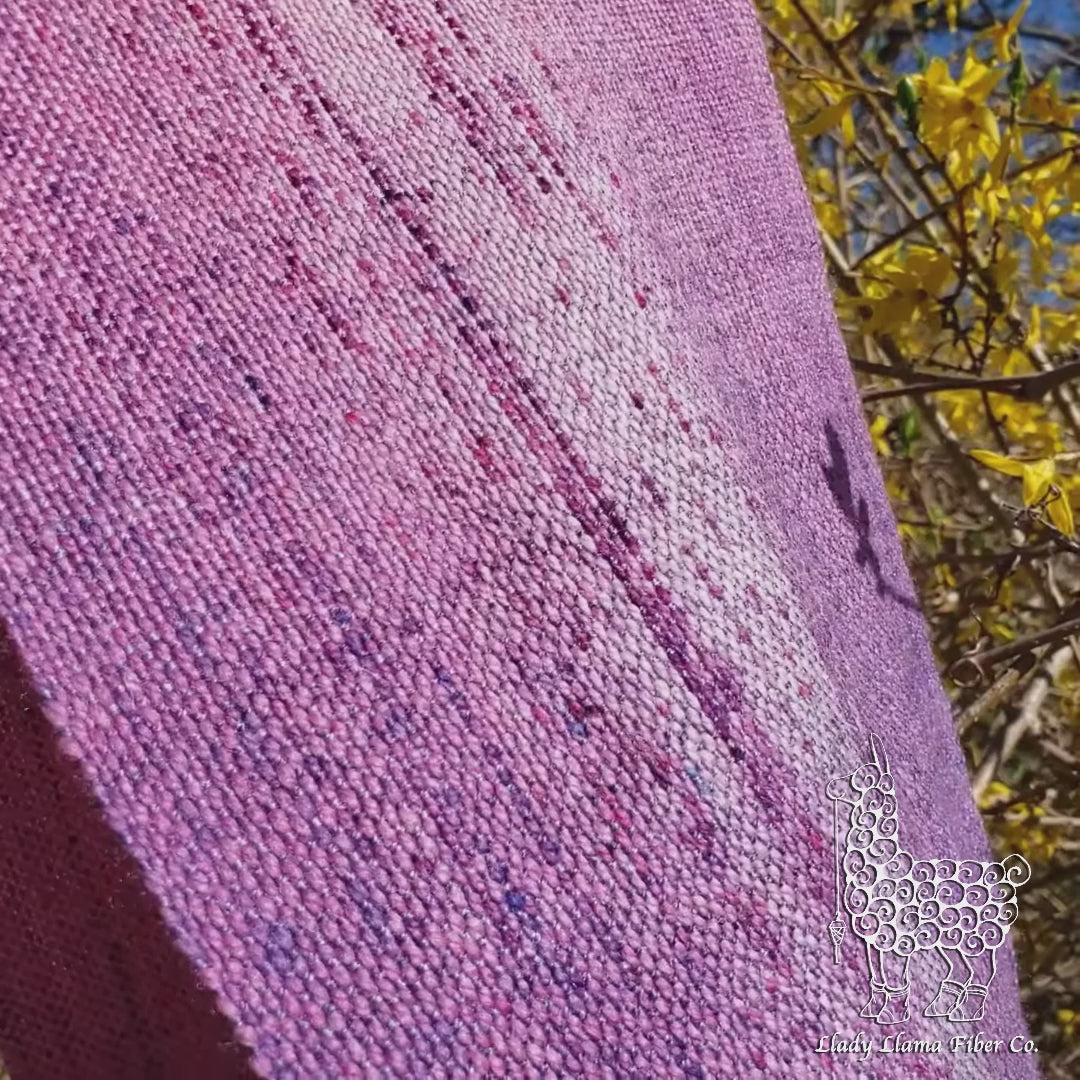 This scarf was handwoven in plain weave on a rigid heddle loom using one set of our gradient speckle dyed Llark Shorty Sock Twins in the colorway "Evil Stepmother" for the warp yarn and a 2-ply handspun yarn made from our Lleaf combed top in the the colorway "Princess of Punk Rock" for the weft.